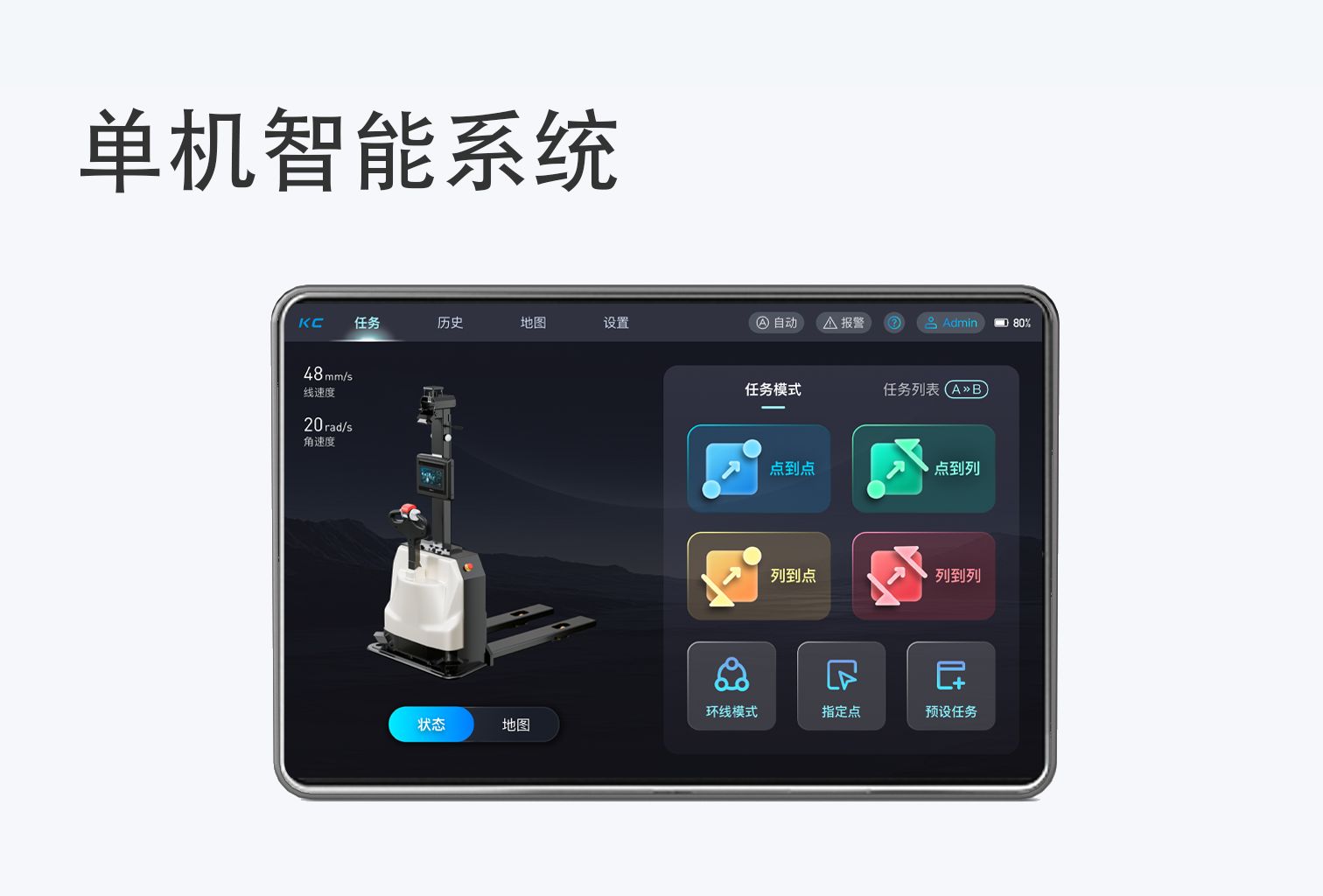 叉式搬运移动机器人适用于对不同高度的成件托盘货物进行装卸、堆垛和运输等自动作业,无需额外特殊载具,即可完成接泊托盘货物所需的升降、承载和搬运等一系列动作,以实现工厂车间的少人化、无人化物流。